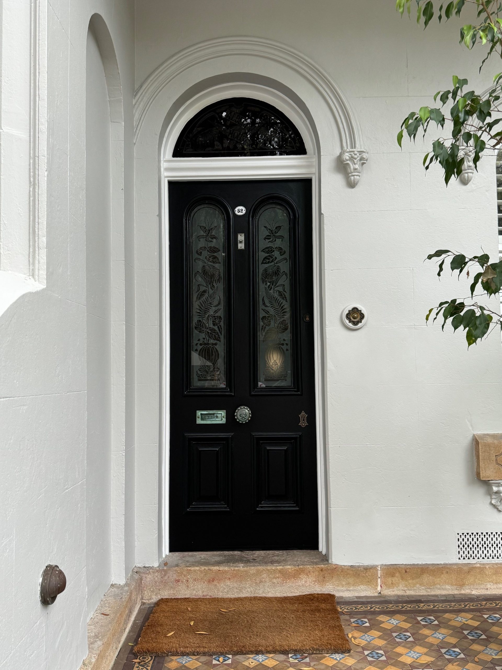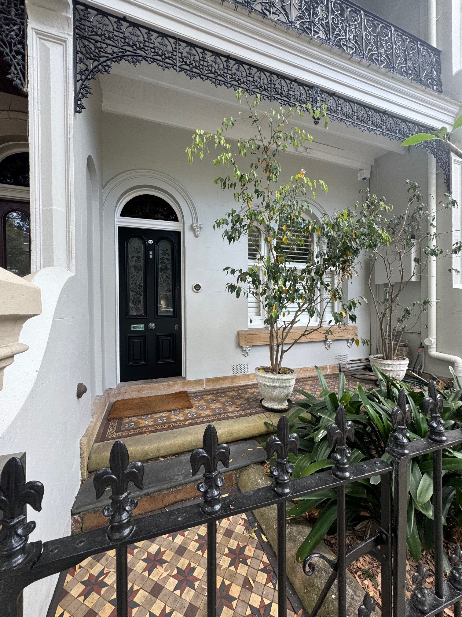 The façade has been restored with a crisp, clean finish that enhances the home’s heritage features. The contrast of the dark entry door against the light exterior creates a strong visual statement while maintaining a timeless look.